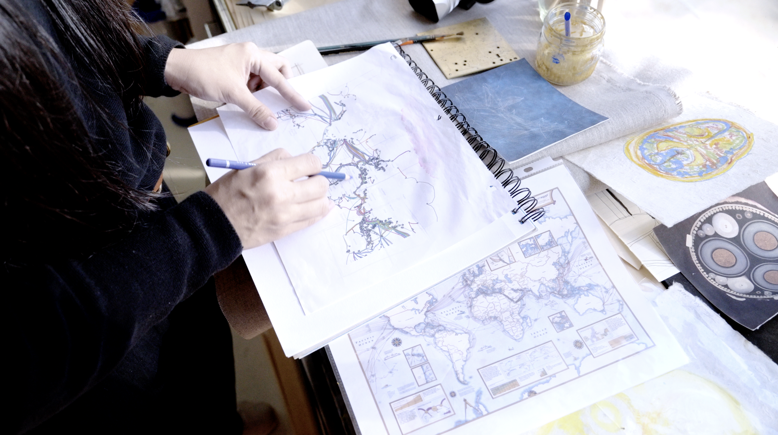 This intimacy with the ocean led her to the hidden systems that run through it: submarine fiber-optic cables, the fragile yet vital infrastructure that carries the world’s information. The 2022 Tonga eruption, which severed a key cable, sparked her Signal series — oil paintings that reimagine these networks as “digital constellations,” fusing planetary systems with human histories, microstructures with global scale.